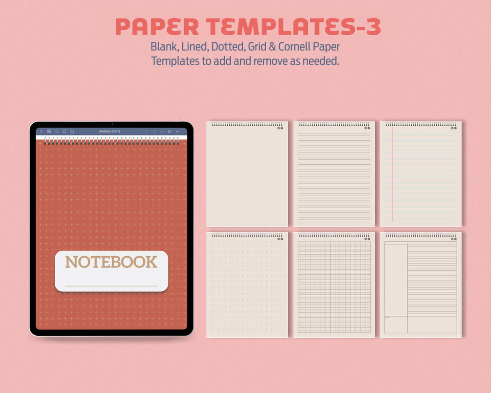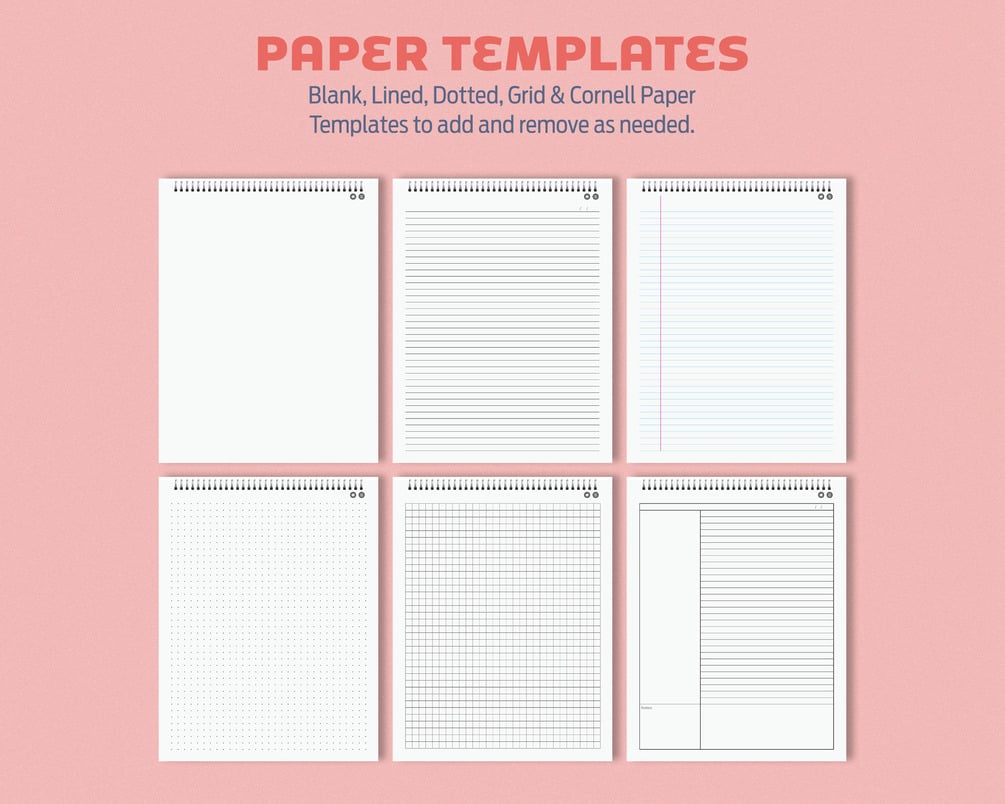 Brighten up your day with a boho color palette digital notepad! This Digital Notebook is hyperlinked to the subject pages for all 132 subjects. Pre-filled with blank, lined, dotted, grid, and Cornell paper templates for you to duplicate and use over and over again!